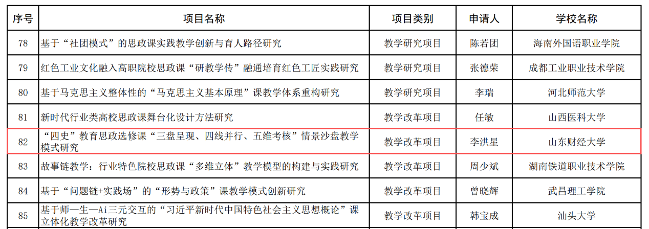 9月25日,教育部社科司公示了2025年度高校思想政治理论课教师研究专项一般项目评审结果,我院李洪星教授主持的课题《“四史”教育思政选修课“三盘呈现、四线并行、五维考核”情景沙盘教学模式研究》喜获立项。