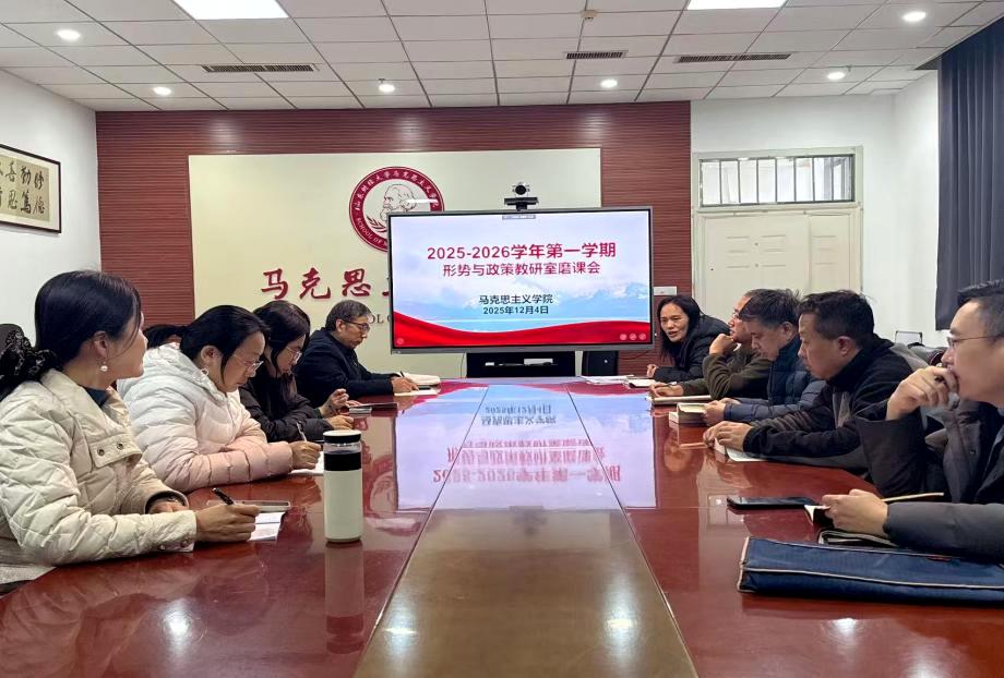为深入贯彻落实党的二十届四中全会精神,扎实推动新时代高校思想政治理论课改革创新,根据学校关于思政课教学质量提升的总体部署�2025�12�4日下午,形势与政策教研室成功举办了以“学习贯彻二十届四中全会精神,深刻解读‘十五五’规划”为主题的集体备课暨磨课研讨会。活动旨在通过深度研讨与集体智慧凝聚,切实提升《形势与政策》课程相关专题的教学质量与育人实效。教研室主任王曼老师主持活动,杨海波老师及教研室全体教师积极参与�